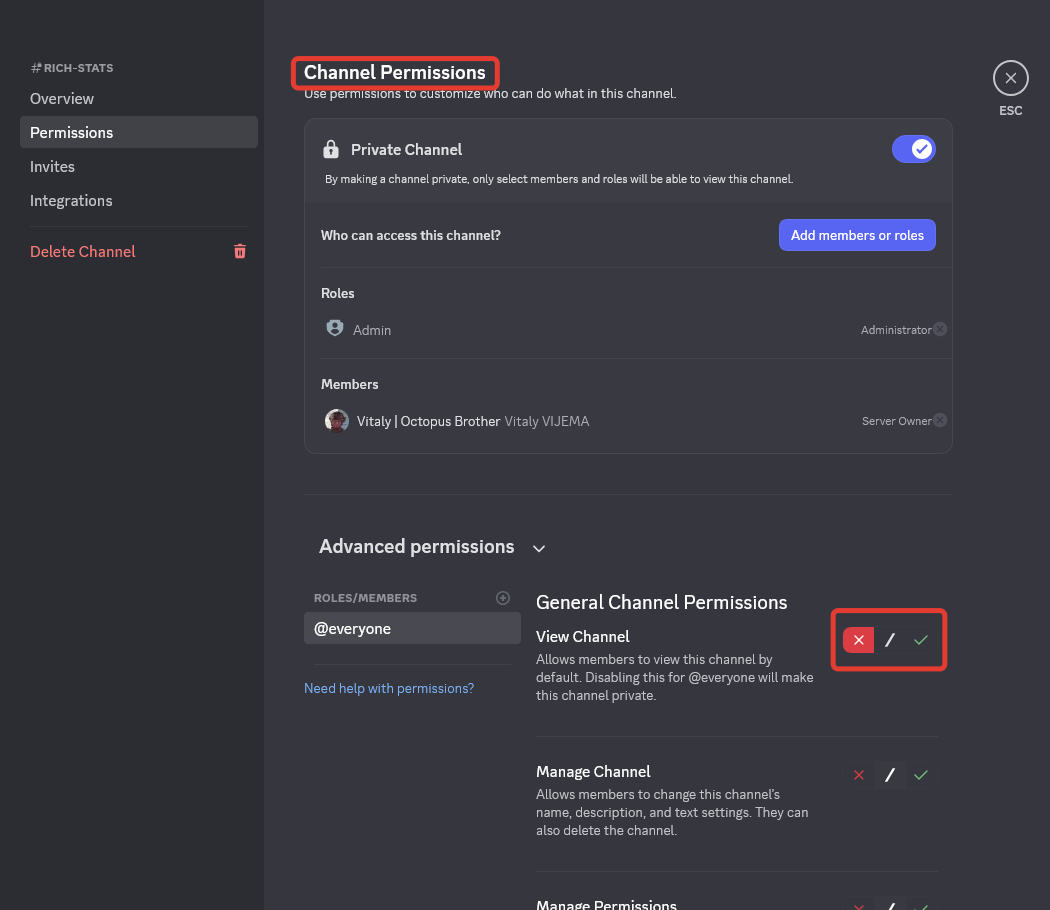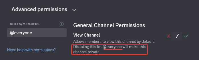 Just remember - every time you activate the red cross button in front of <mark style="color:$success;">View Channel</mark> permission for the <mark style="color:yellow;">**@everyone**</mark> role in the **Channel Permissions**, it makes the channel private, and, in most cases, inaccessible for <mark style="color:purple;">**Bocto**</mark> even if some roles besides <mark style="color:yellow;">**@everyone**</mark> have permission to post in this channel! So we need to avoid this!