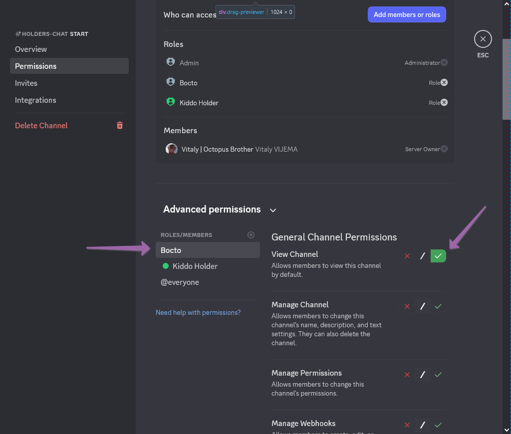 You will now see <mark style="color:purple;">**Bocto**</mark> in the **ROLES/MEMBERS** list in the **Advanced permissions** section. Select it, and forcibly allow the <mark style="color:$success;">View Channel</mark> permission by clicking on a green check mark.