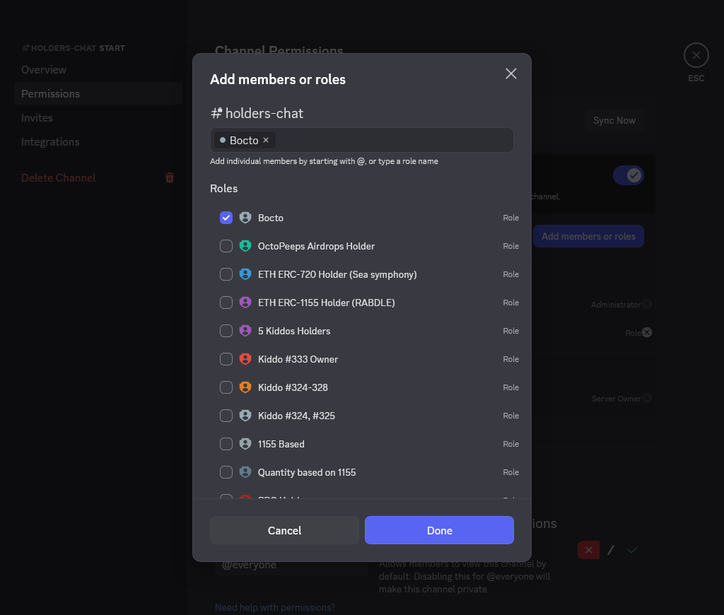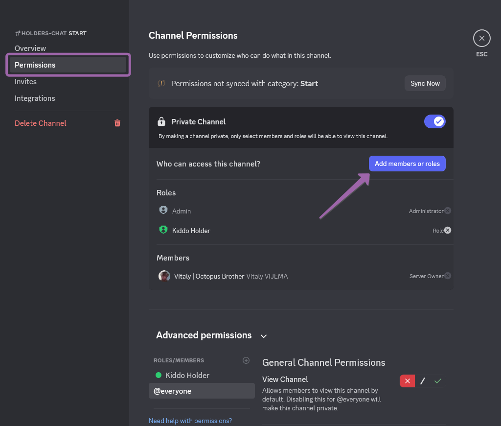 To do this, go to **Discord**, open the <mark style="color:yellow;">**#holders-chat**</mark> (or corresponding) channel settings, move to the **Channel Permissions** section, and press the <mark style="color:purple;">**Add members or roles**</mark> button.
