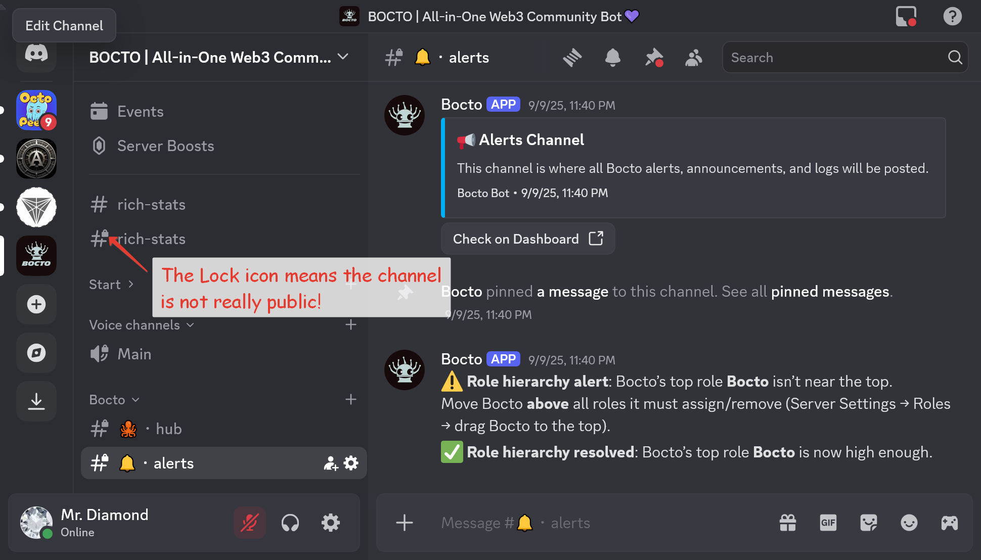 To prevent this, ensure that the channel you want <mark style="color:purple;">**Bocto**</mark> to post something in is really public by looking at its name in the sidebar - if there is no 🔒 icon on a <mark style="color:yellow;">**#**</mark> sign, then everything is set up correctly, but if you see one, that means you've probably used an incorrect settings combination for the <mark style="color:yellow;">**@everyone**</mark> role.